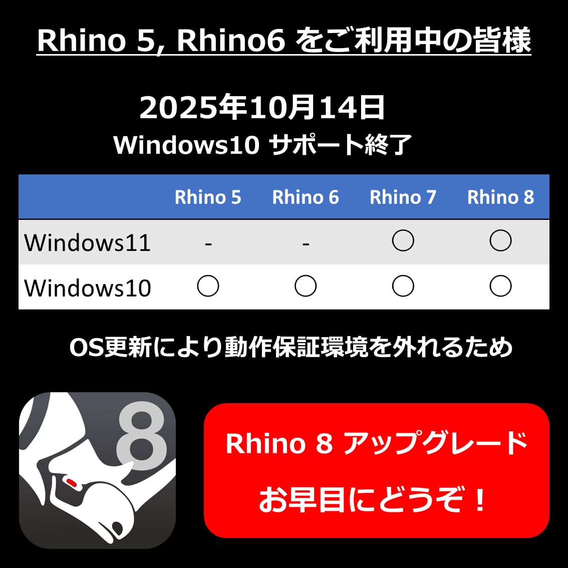 ※Rhino5, Rhino6をお使いの方へ|Windows10サポート終了期限は2025年10月14日です。Rhino5, Rhino6は動作保証環境から外れるため、サポート対象外となりますのでご注意ください。OS及びRhinoのお早目のアップグレードをお勧めします。