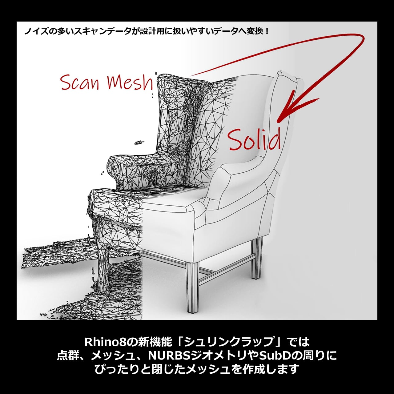 ■シュリンクラップ:3Dスキャナで測量した点群データの周りにピッタリ閉じたメッシュを作成する事ができます。